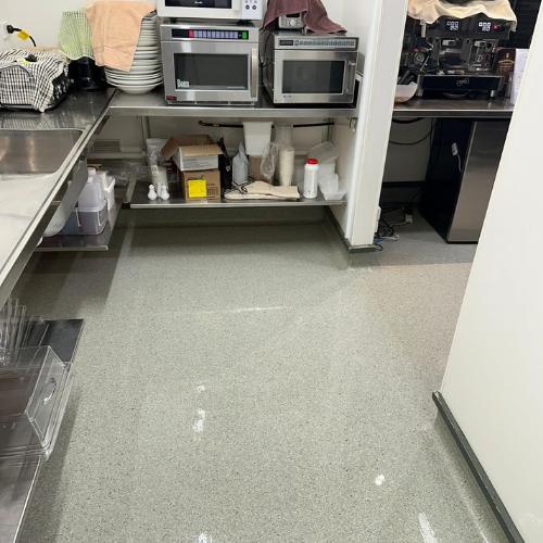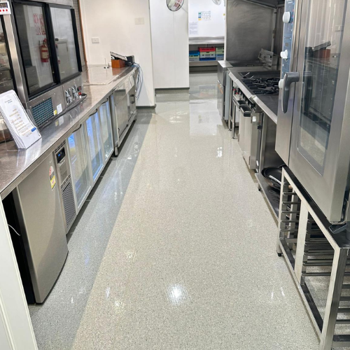 The floors are cleaned to remove dirt, debris, and any existing finishes that could interfere with the polishing process.